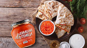 Подготовка: Премачкуваме 1 тортиља со една супена лажица Димс лутеница. Така спремната тортиља ја ставаме во тавче на малку масло и редиме печурки, маслинки и кашкавал. Поклопуваме со втора тортиља и ги пржиме од двете страни по 2-3 минути додека не добијат златен изглед.